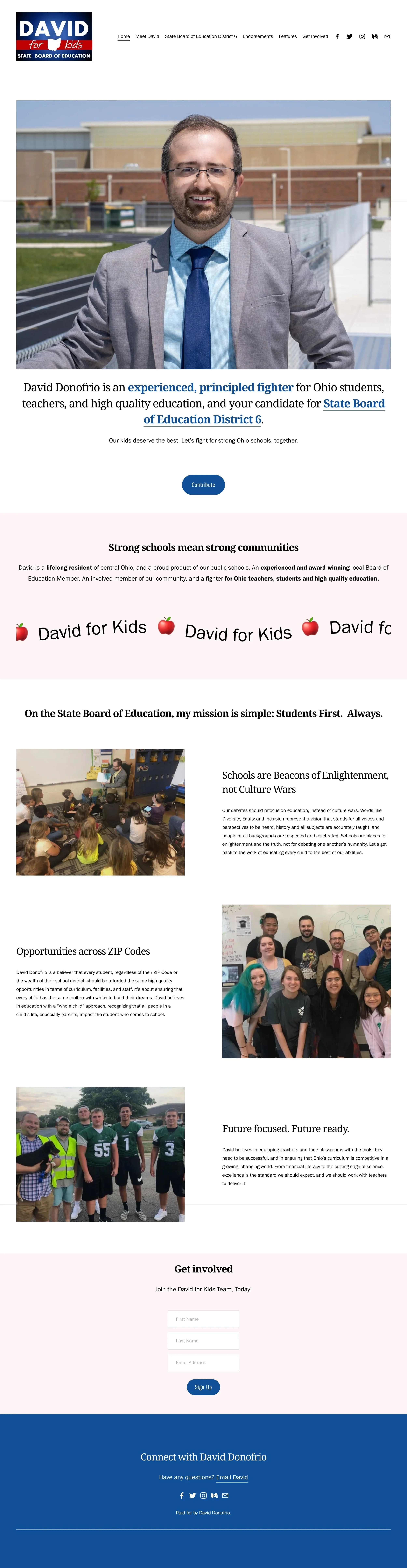 For David Donofrio, we delivered a platform to launch his campaign for State Board of Education. We built a clear, authoritative Squarespace site designed to mobilize voters and drive donations.