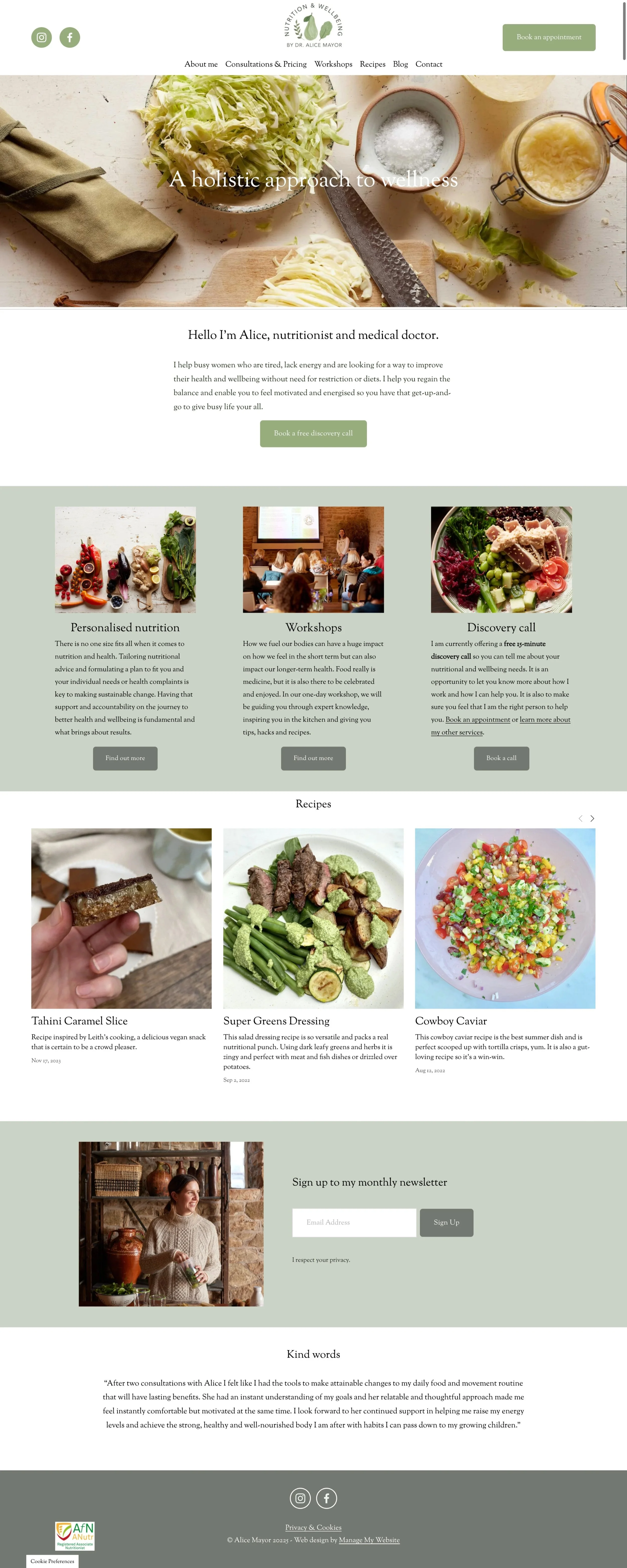 Dr. Alice Mayor needed a credible and approachable platform to launch her practice. We delivered a complete Figma-to-Squarespace build, creating a professional site that builds trust and simplifies client booking.